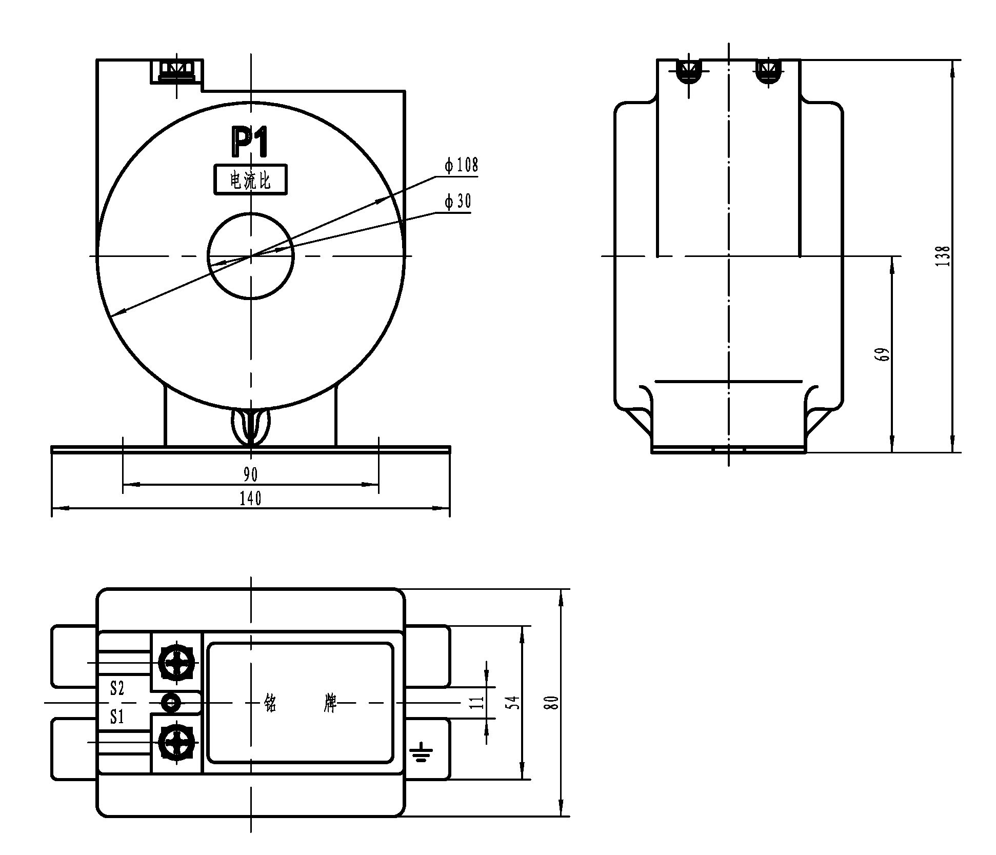 ●結構:電流互感器的鐵心為環(huán)形和矩形兩種。二次繞組沿鐵芯周均分布,采用環(huán)氧樹脂澆注為電流互感器外殼,電流互感器的設計為窗孔,供一次母排或電纜穿過。P1標記為一次進線端;P2標記為一次出線端;二次電流由S1流出端;S2為流入端,即為減極性。