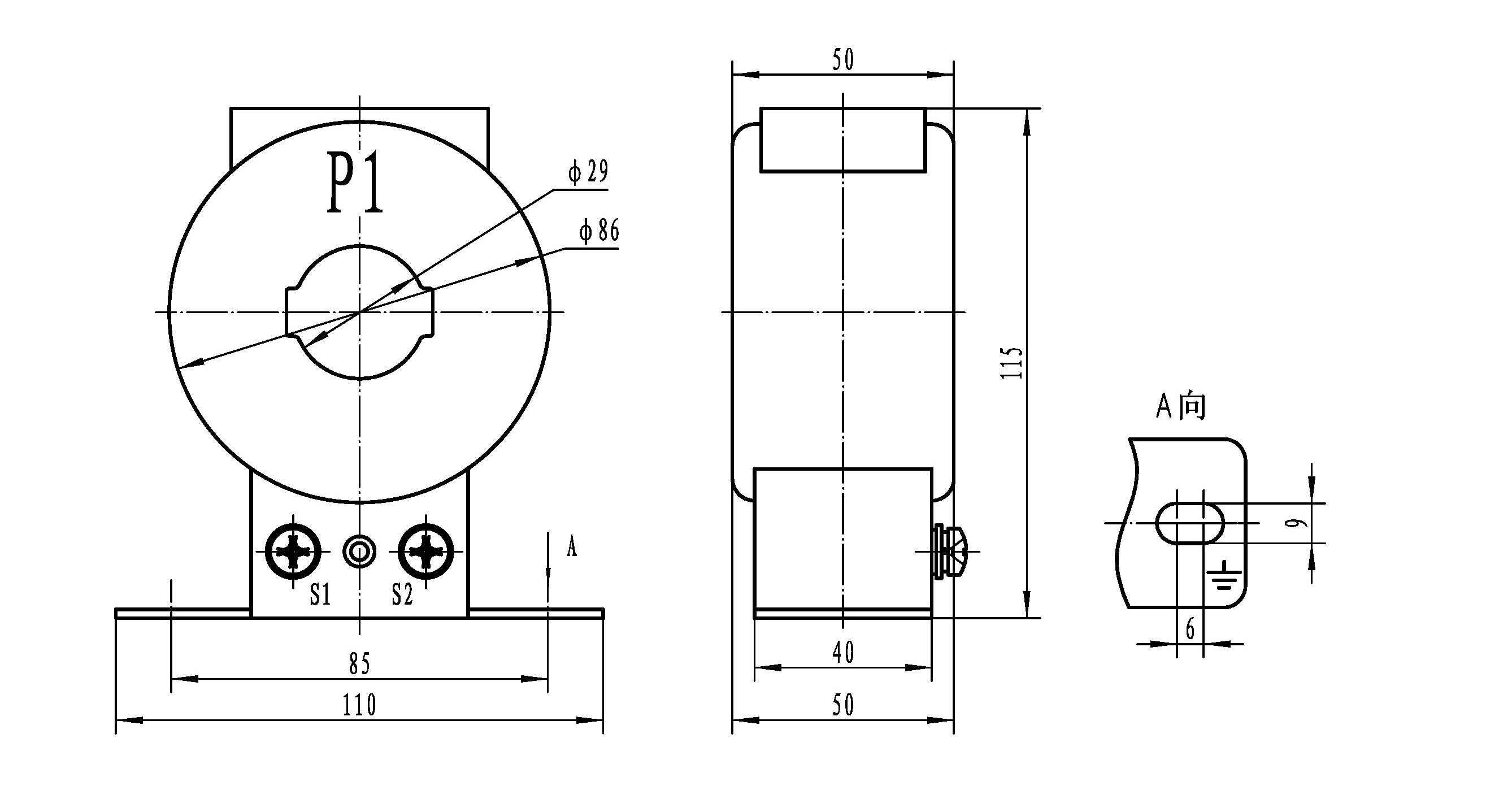 ●結(jié)構(gòu):電流互感器的鐵心為環(huán)形和矩形兩種。二次繞組沿鐵芯周均分布,采用環(huán)氧樹脂澆注為電流互感器外殼,電流互感器的設(shè)計(jì)為窗孔,供一次母排或電纜穿過。P1標(biāo)記為一次進(jìn)線端;P2標(biāo)記為一次出線端;二次電流由S1流出端;S2為流入端,即為減極性。